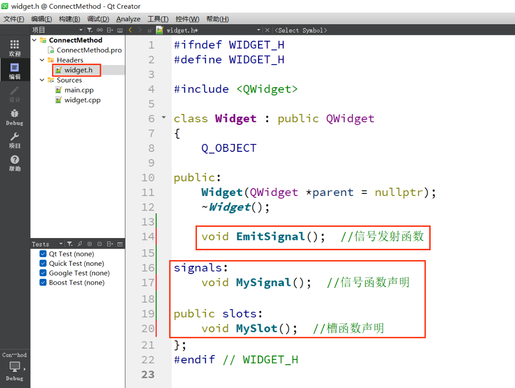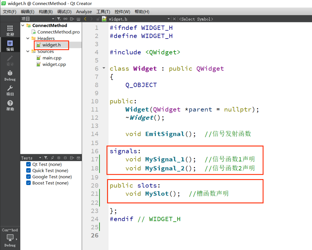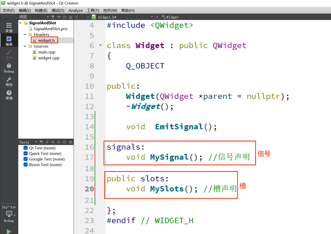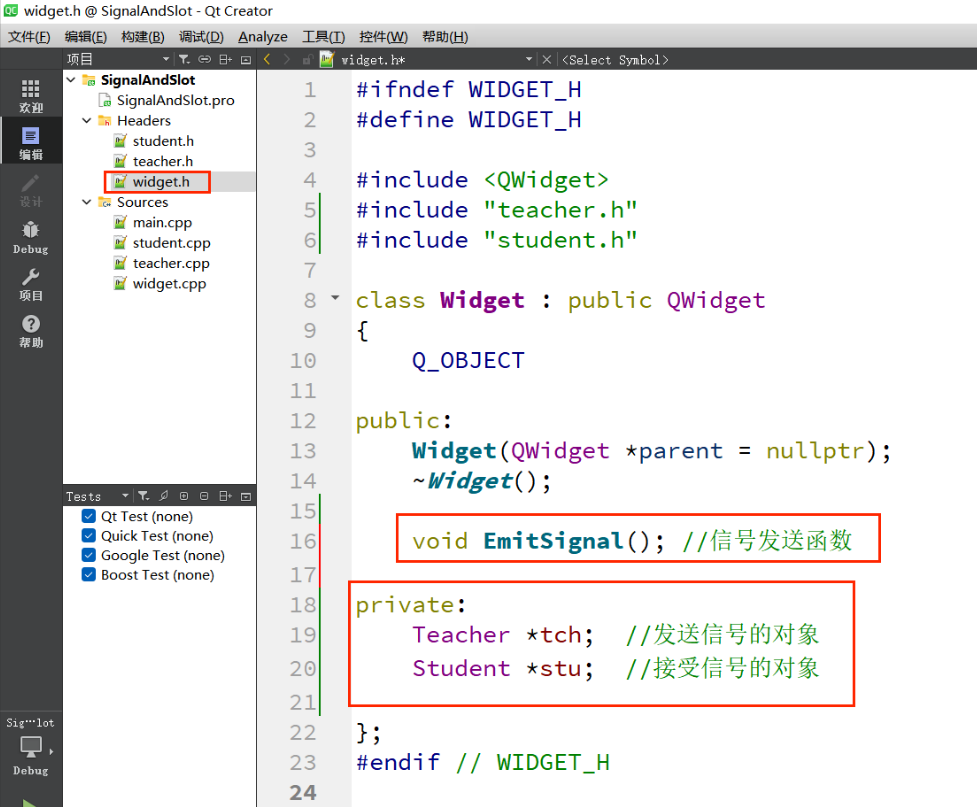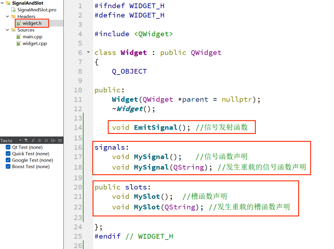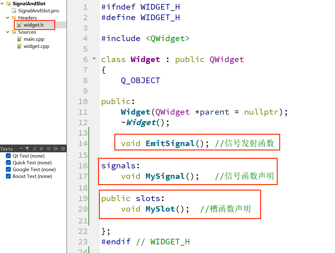 1、在 "widget.h" 中声明信号和槽以及信号发射函数;