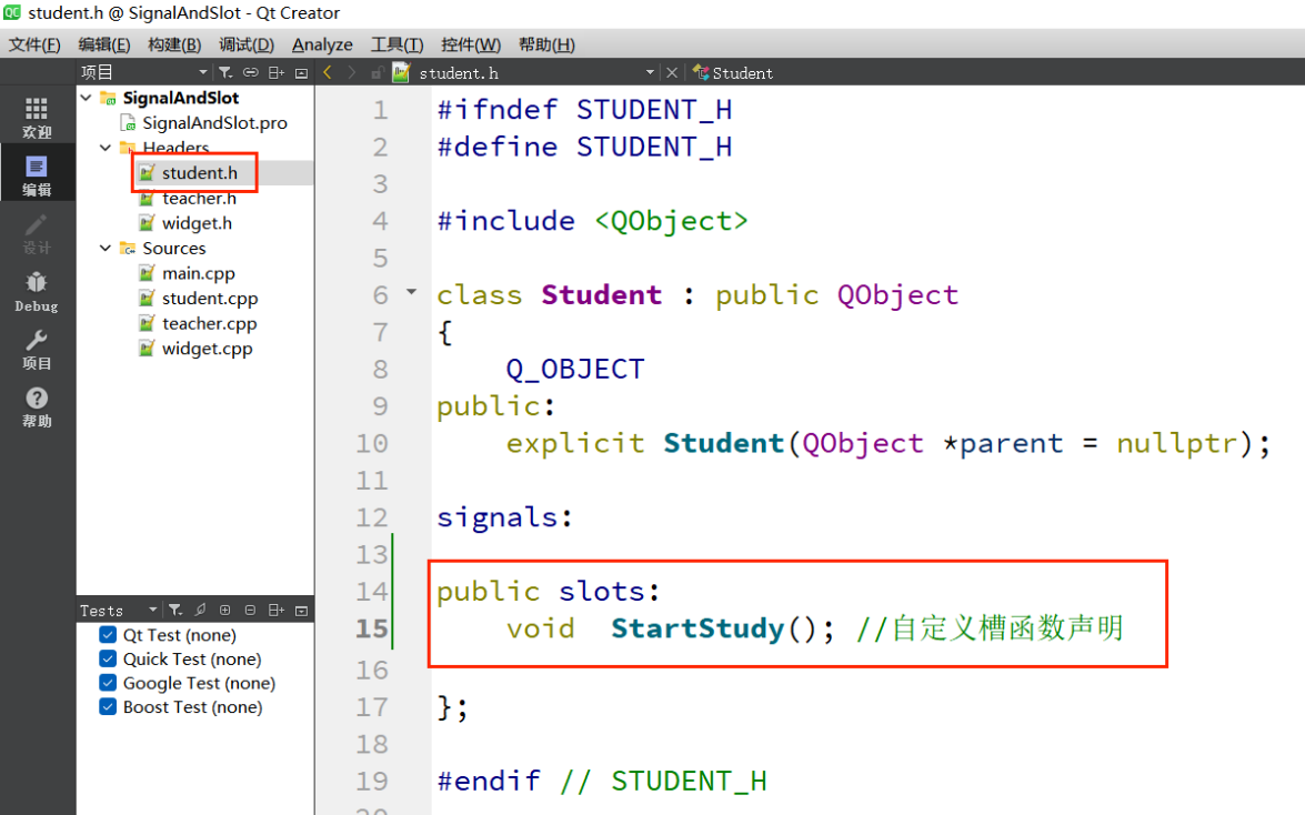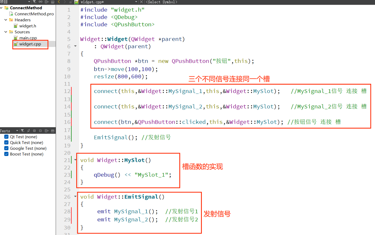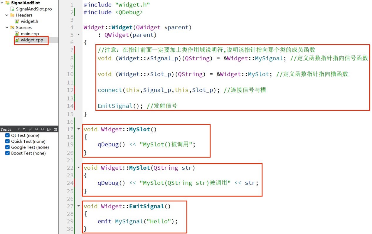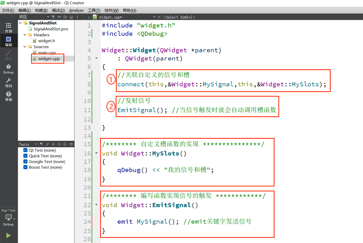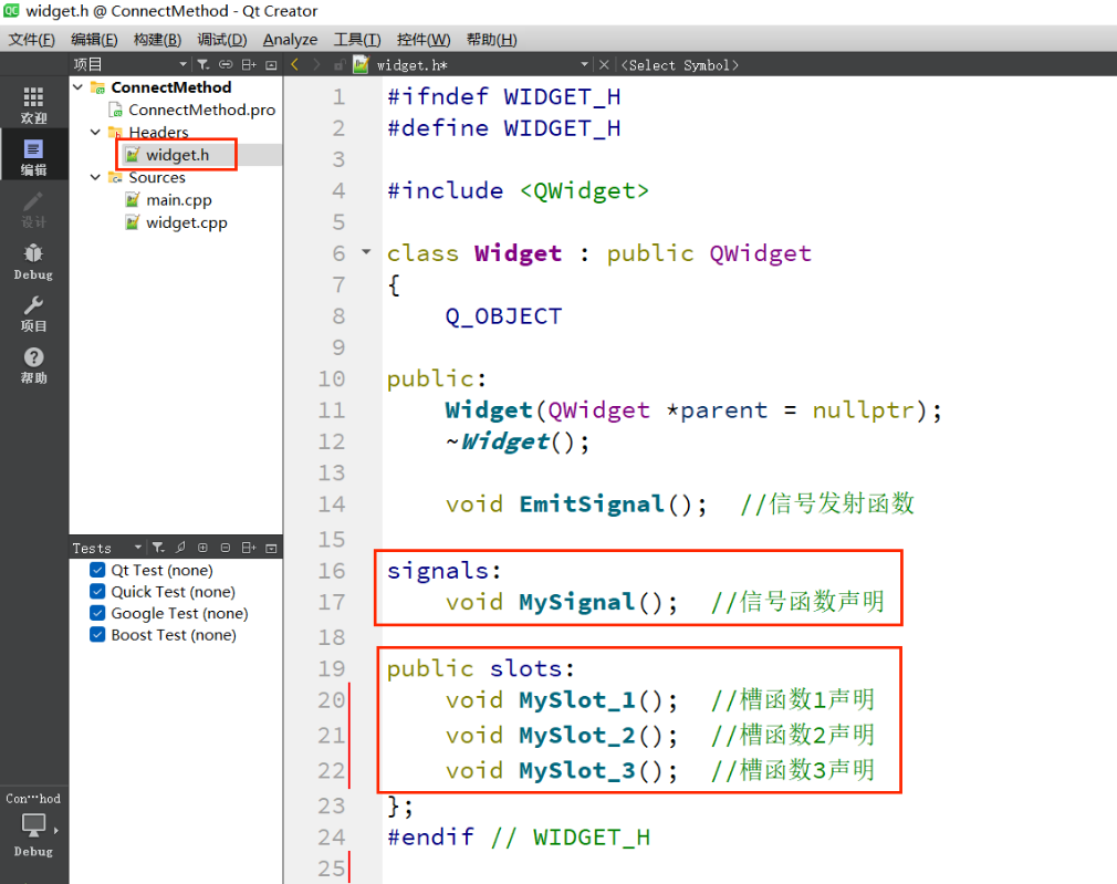 1、在 "widget.h" 中声明信号和槽以及信号发射函数;
