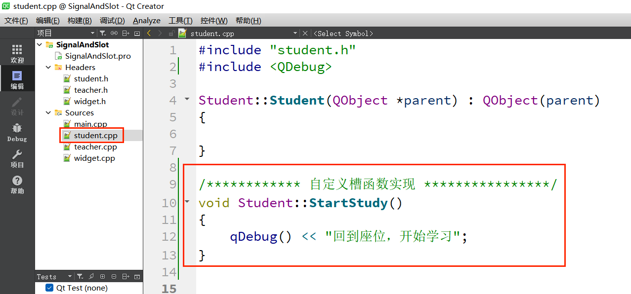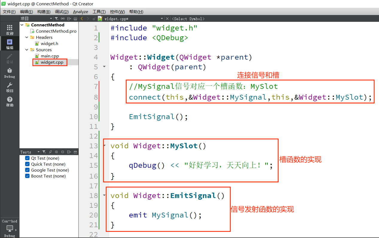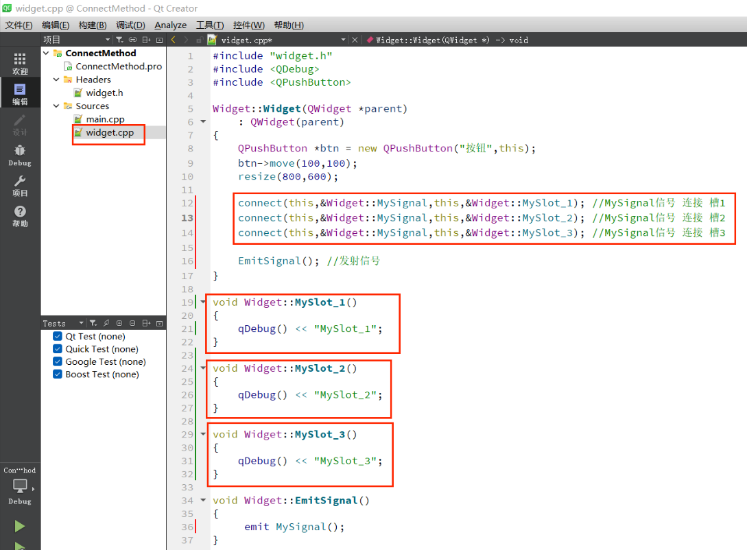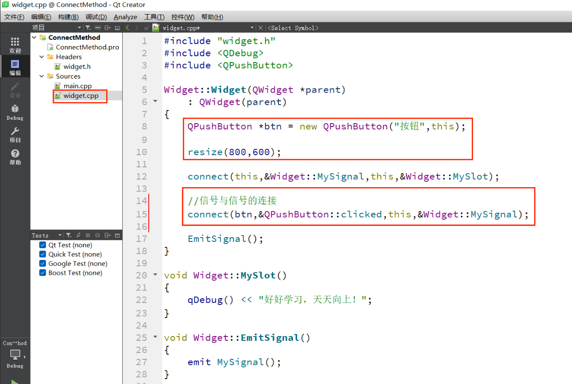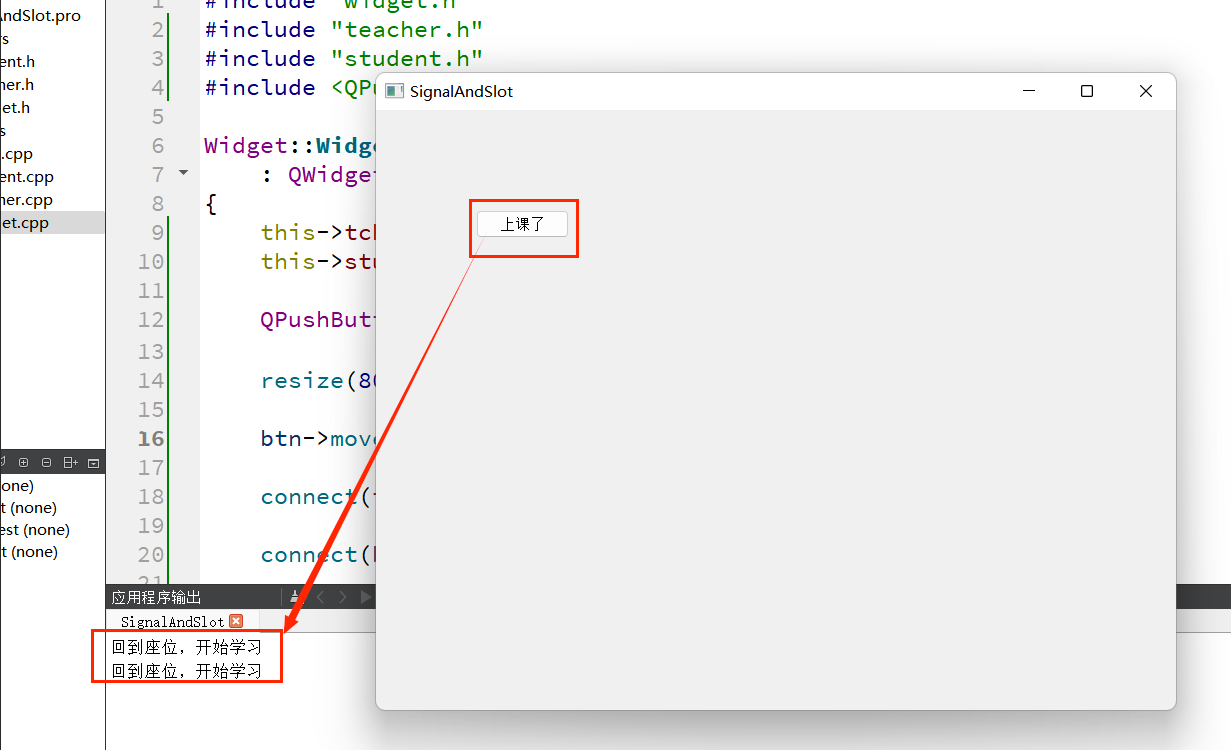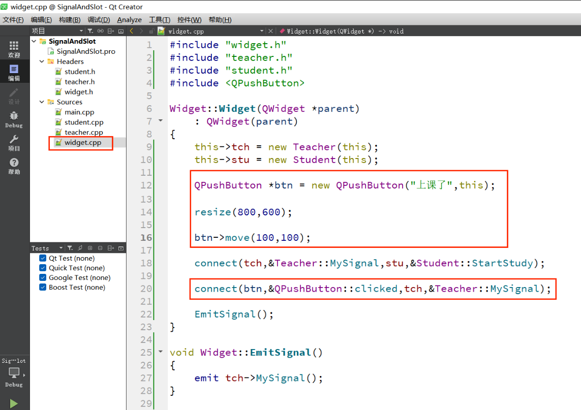 2、在 widget.cpp 中实现槽函数,并且关联信号和槽