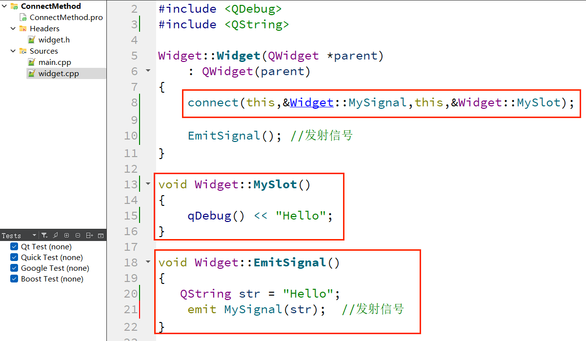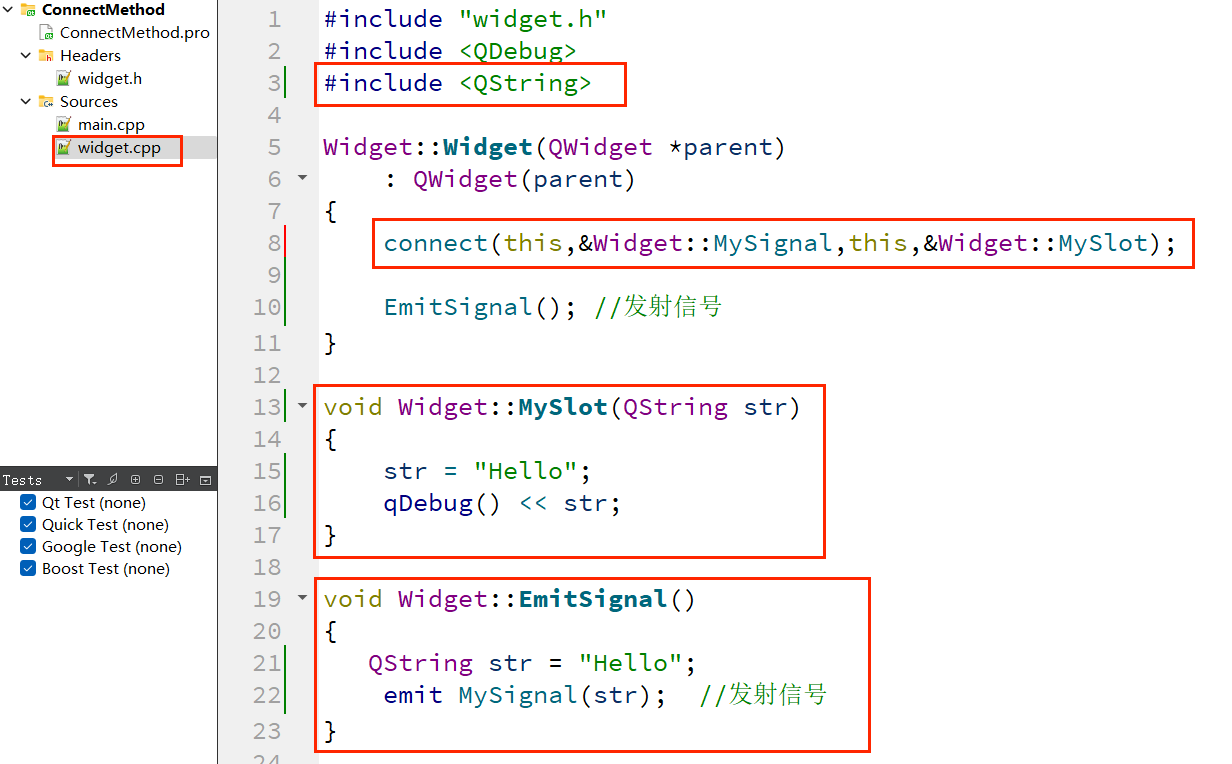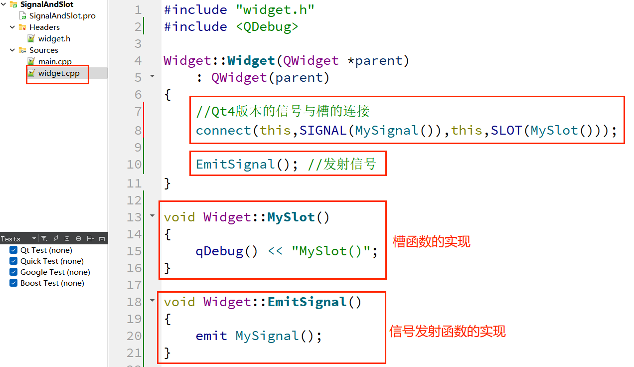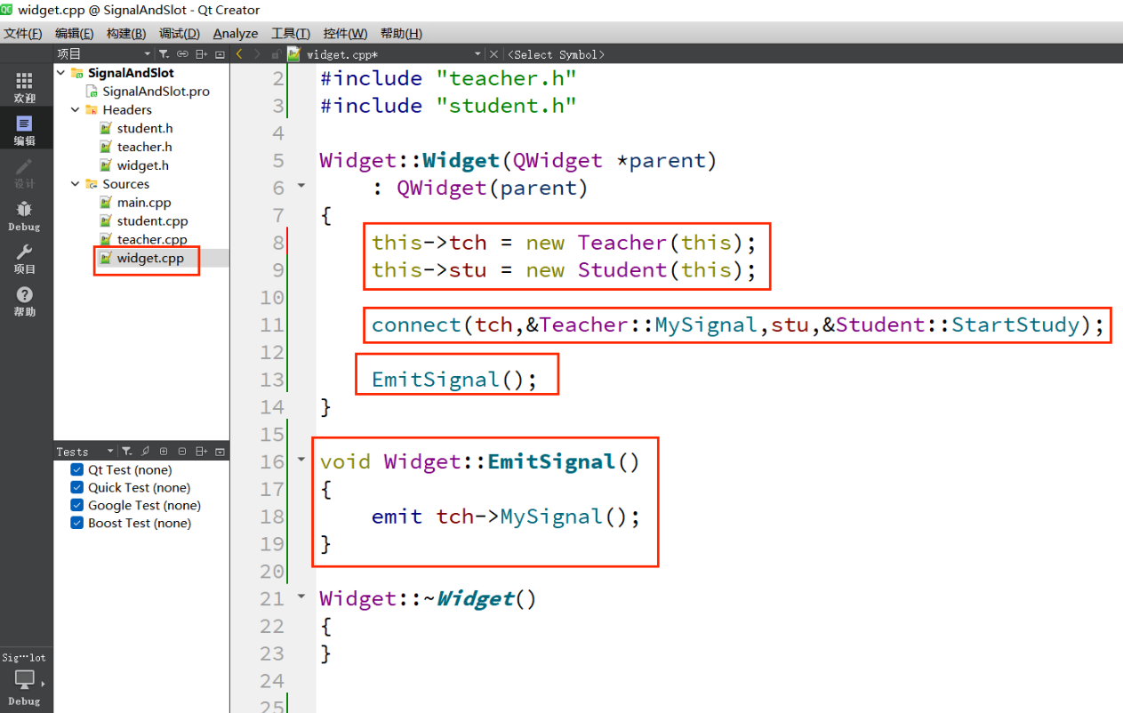 2、在 "widget.cpp" 中实现槽函数,信号发射函数以及连接信号和槽;