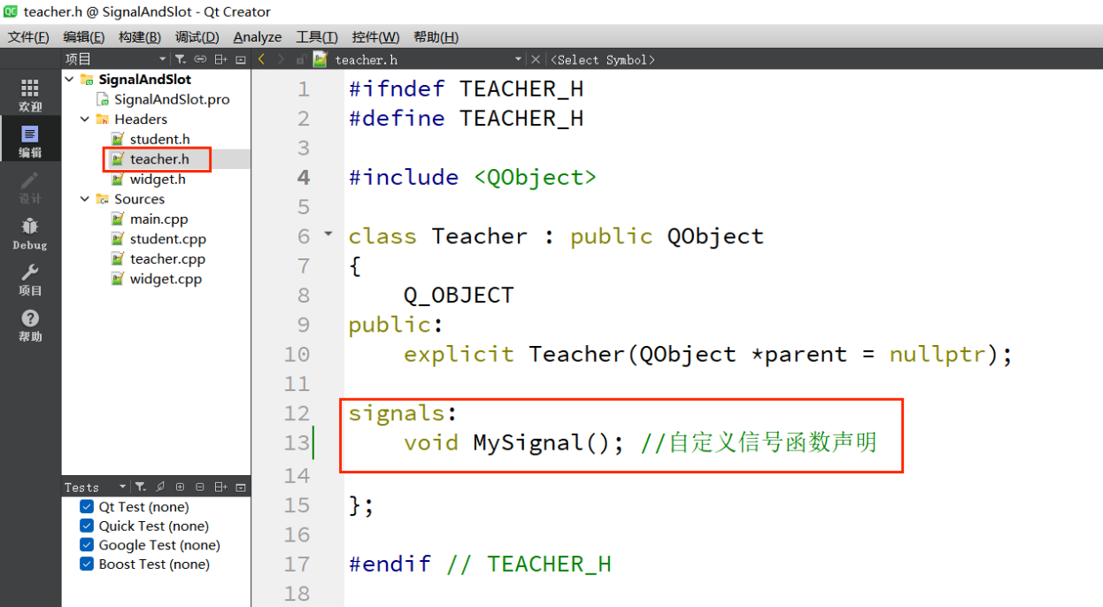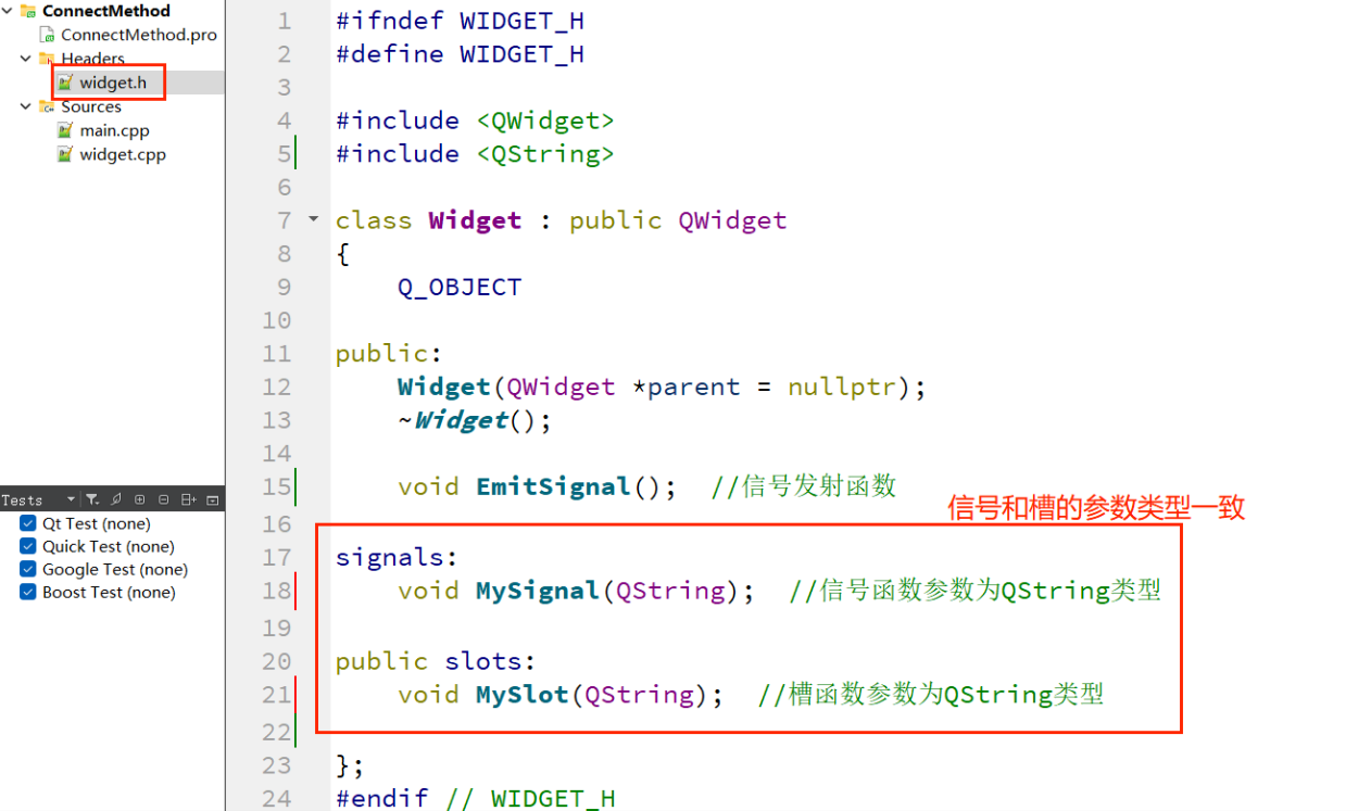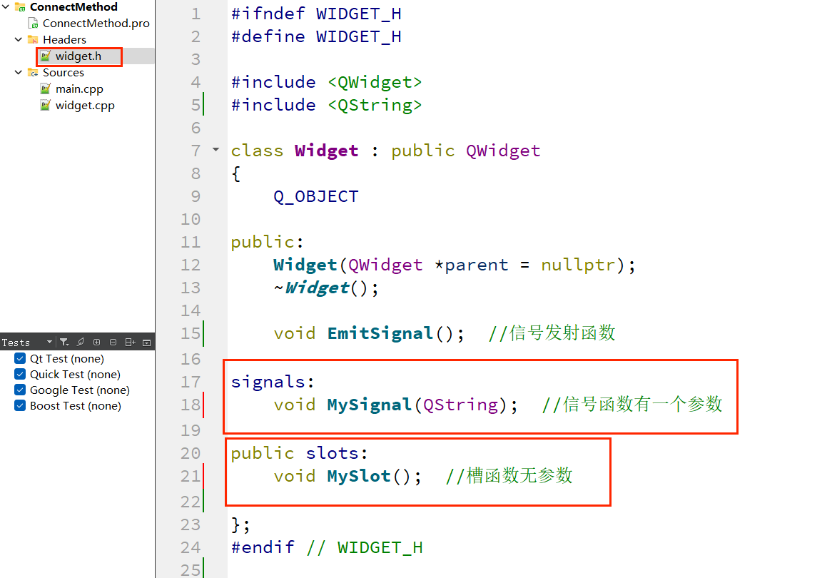 1、在 widget.h 中声明⾃定义的信号和槽,如图所⽰;