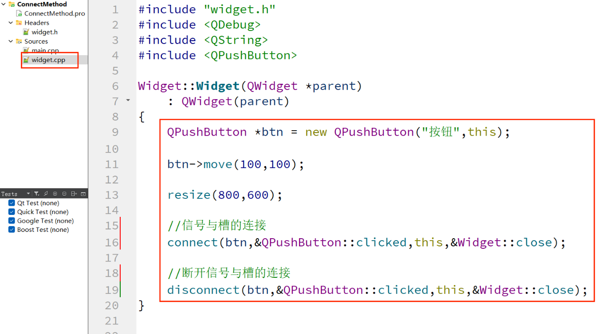 在上述⽰例的基础上,在 "widget.cpp" ⽂件中添加如下代码: