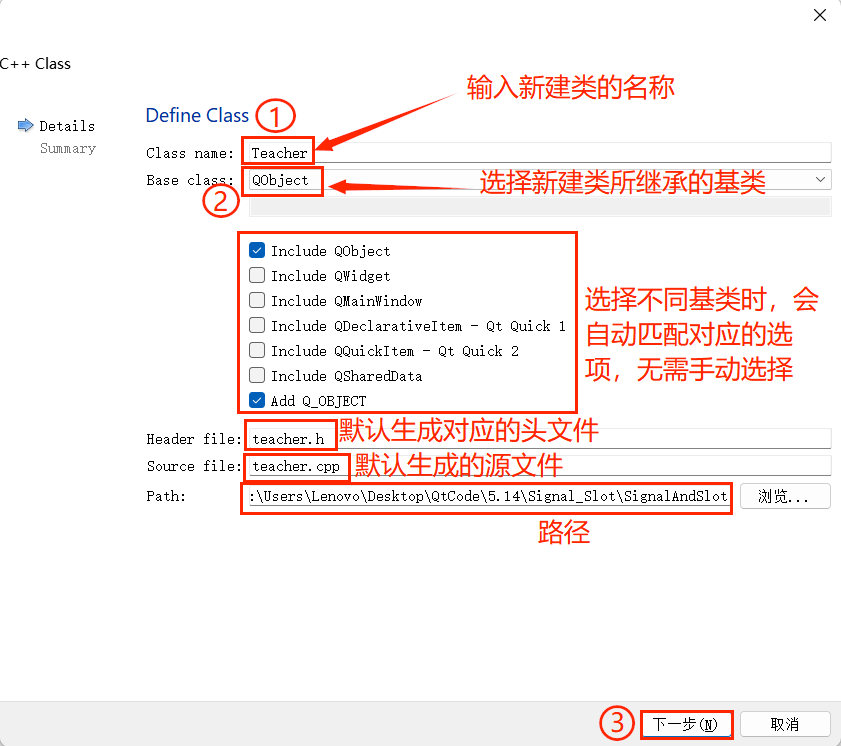 注意:在 Qt 中新建类时, 要选择新建类的⽗类.显然,当前项⽬中还没啥类适合做新类的⽗类, 同时新的类也不是⼀个 "窗⼝" 或者 "控件". 这种情况⼀般选择 QObject 作为基类.这样做的好处是这个新类的对象可以搭配 Qt 的对象树机制. 便于对象的正确释放.