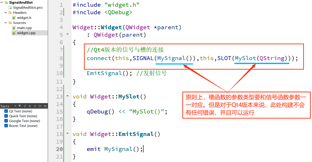 此处我们要求, 信号函数的参数列表要和对应连接的槽函数参数列表⼀致.