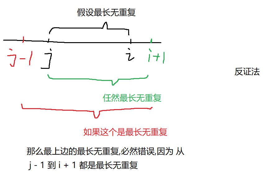 因为我们之前的假设, j 位置是 到达 i 位置, 最长的无重复的子串, 那么当 i 向后走一步 到 i + 1 如果出现在了 j - 1或者更之前的位置, 那么必然 j 位置不是 到达 i 位置的最长的无重复的子串, 而是从j - 1或者更之前的位置是最长的无重复的子串.