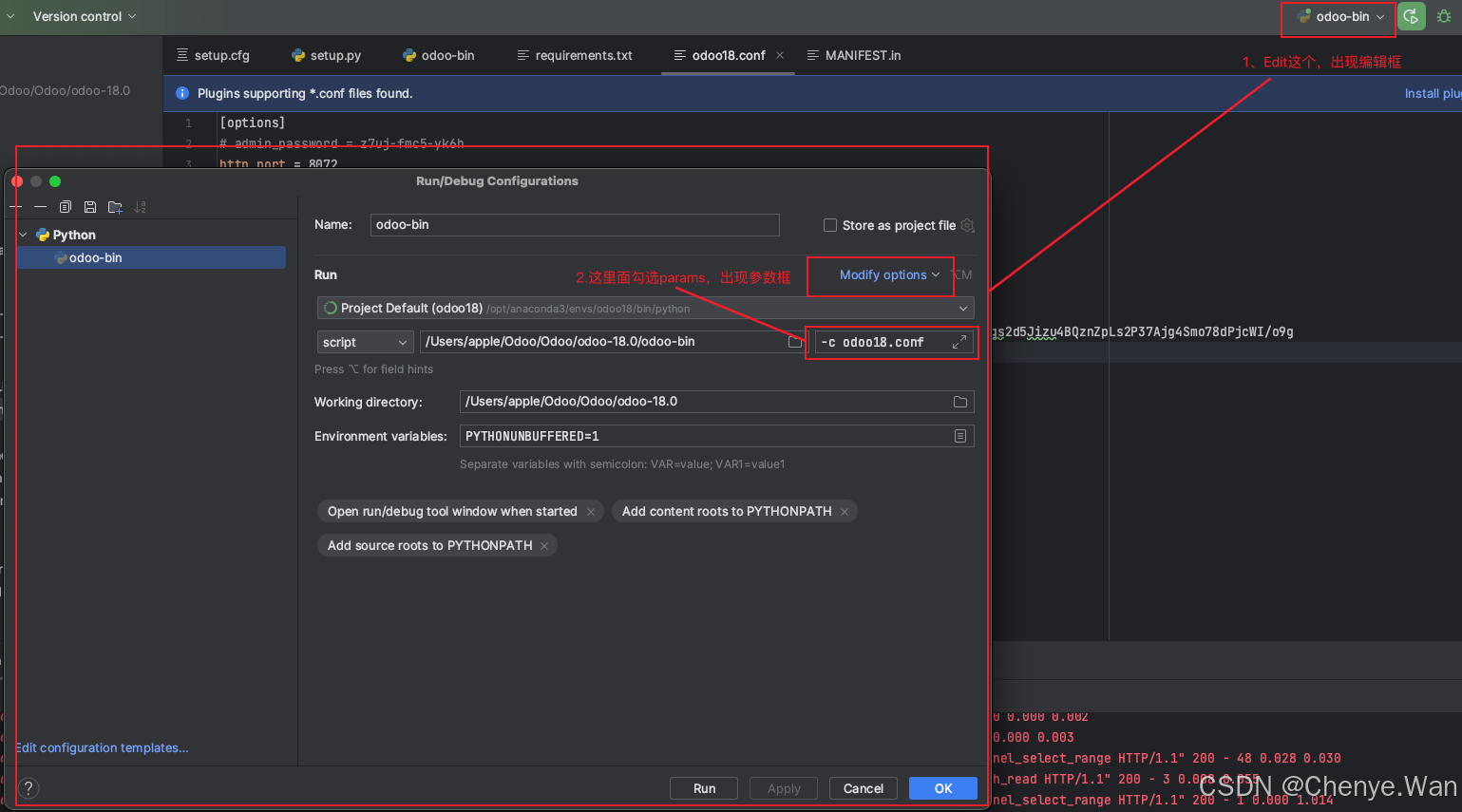 7、在odoo-bin文件里面运行程序,会报错,但可以edit启动器,添加一个params(-c odoo18.conf),然后重新启动
