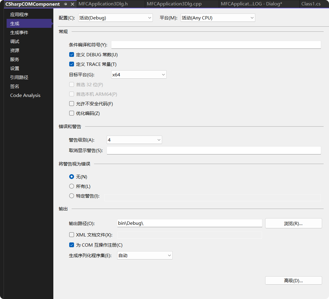 在下面的“为COM互操作注册”前打勾。目标平台选x64。