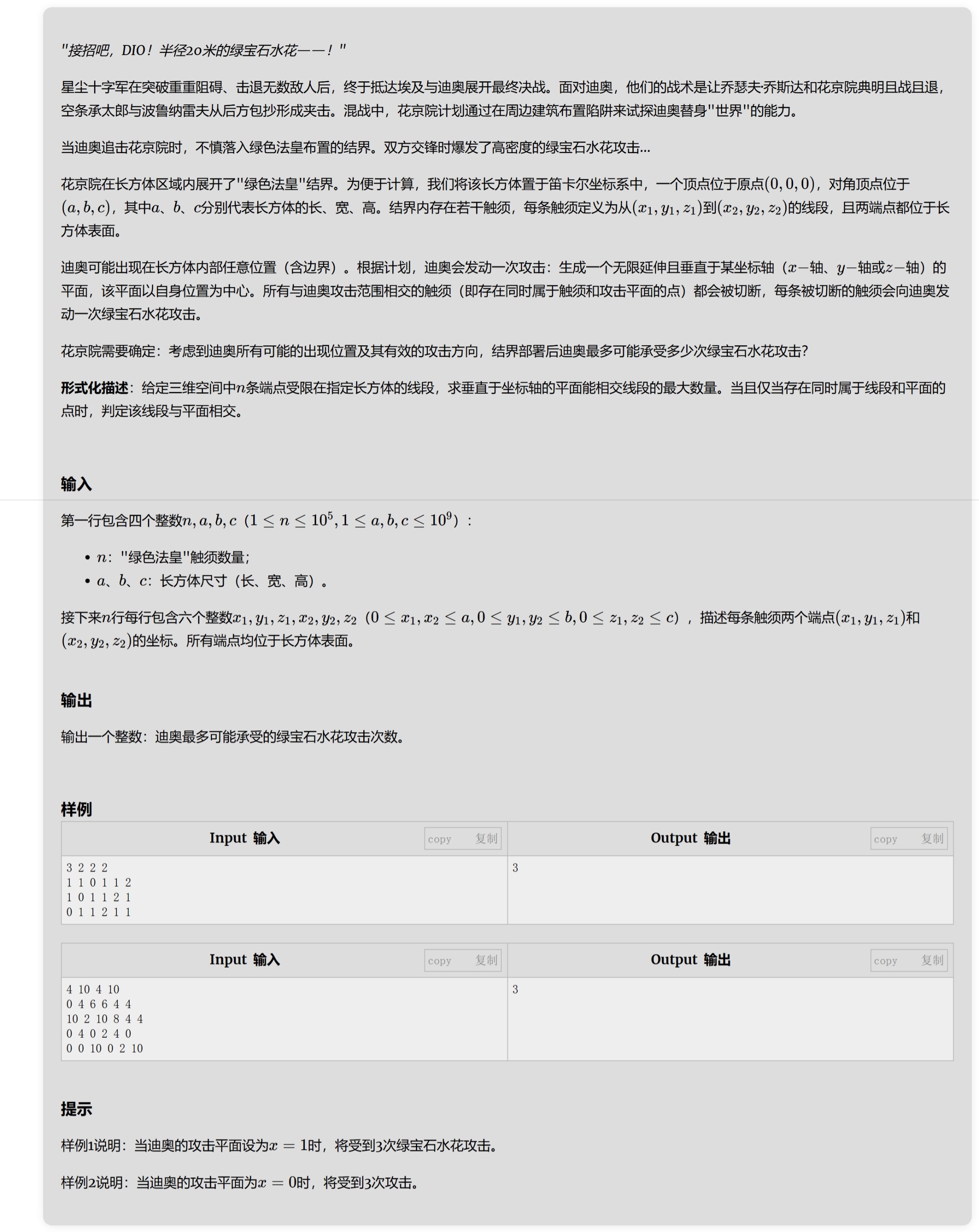 题意为在三维空间中有多条线段,其端点在给定的长方体上,求与坐标轴垂直的平面最多能和多