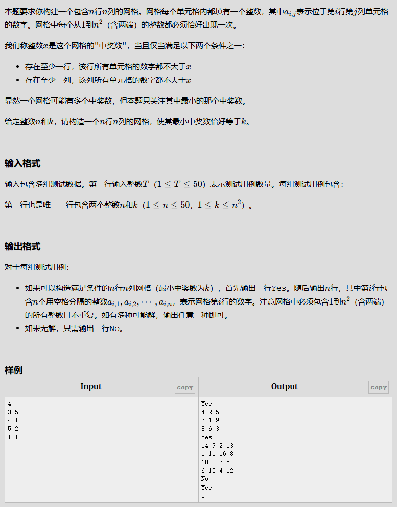 通过对样例模拟可以发现,要满足题目要求k的范围要在[n,n*(n-1)+1]之间。将对角线放上k到k+n-1,剩下的位置从 1 开始填,即可满足条件。