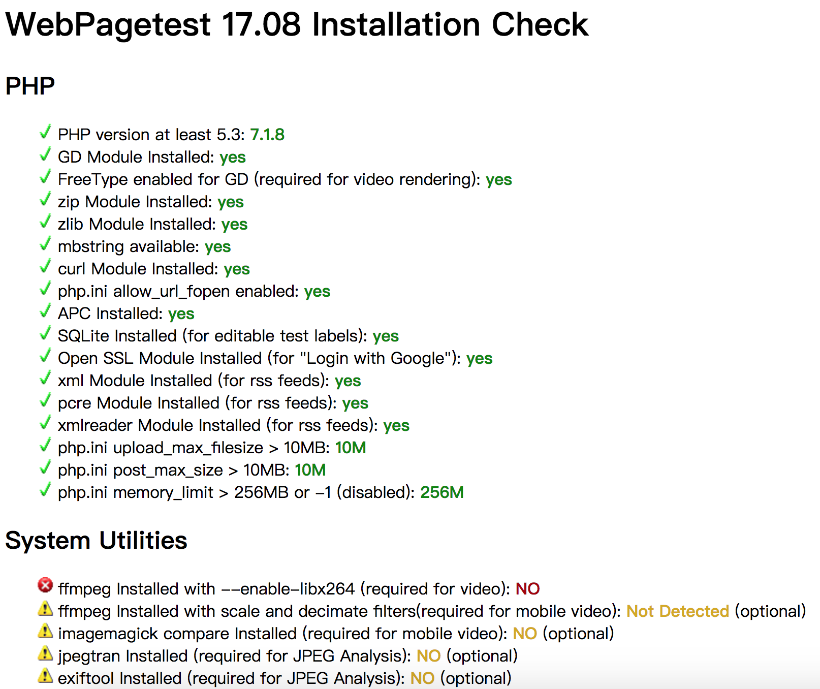 下载后解压,得到www、agent、wptagent等目录,其中www为服务端,agent为 Windows 测试端(本次不使用),wptagent为最新的多平台测试端(也就是本次使用的测试端)。将 www和wptagent文件夹(前者是服务端,后者是测试端)移动到/Users/your_user_name/WebPageTest下,重启 Apache。打开浏览器,访问localhost/install如下图: