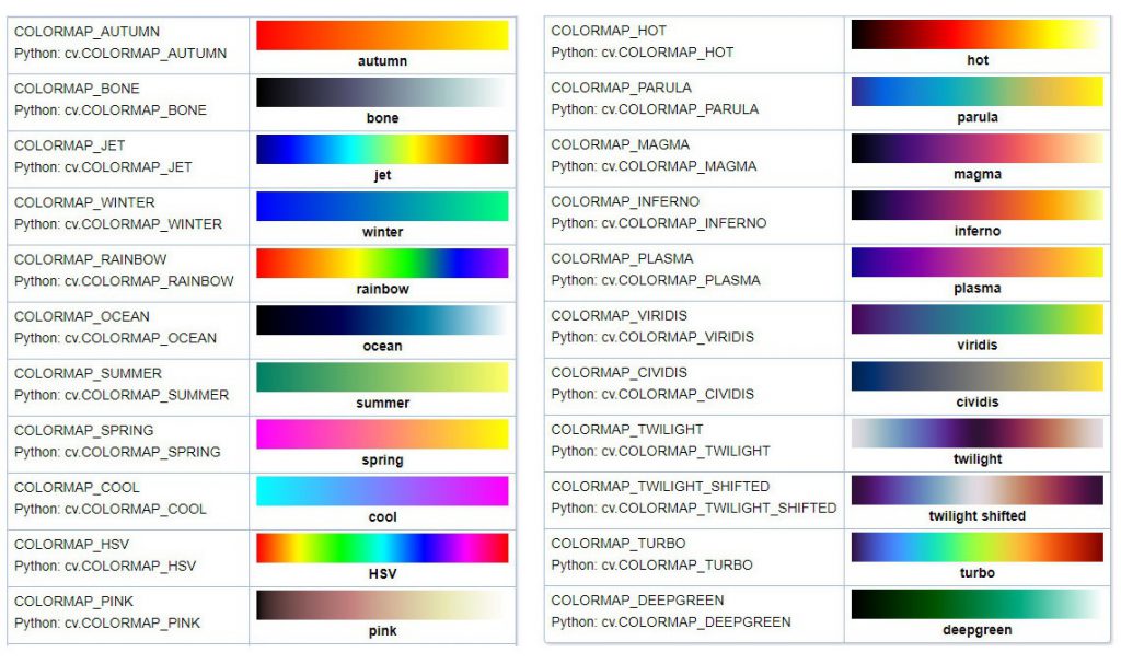 colormap为颜色图模式,可以传入整数0~21对应各种不同的颜色图,或者用cv2.COLORMAP_AUTUMN(等价于0)、cv2.COLORMAP_BONE(等价于1)等方式传入,OpenCV源码头文件中定义的22种模式如下: