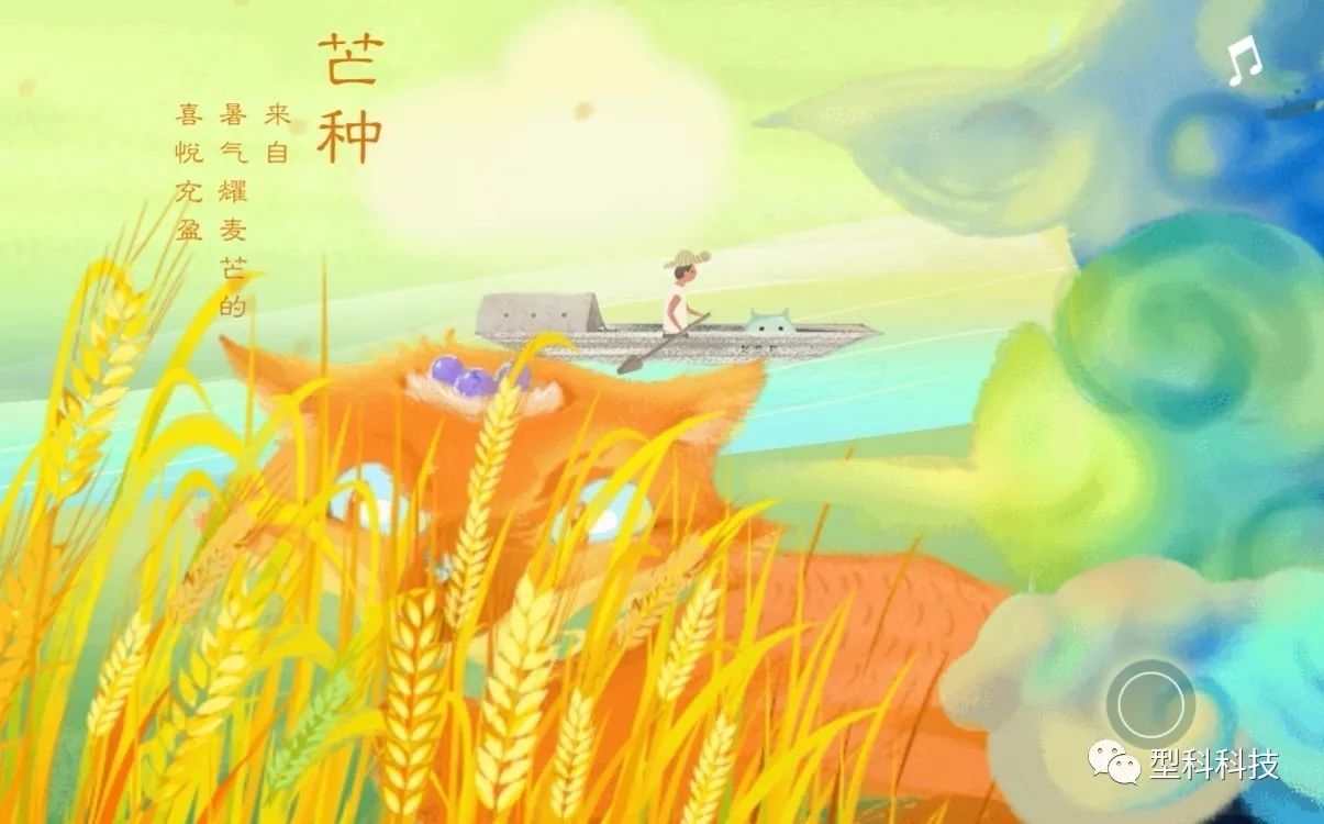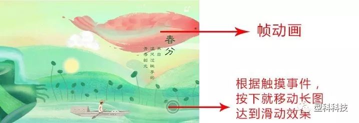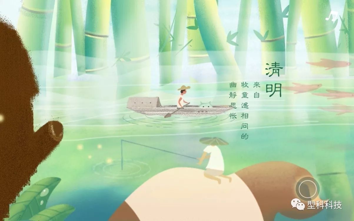 进入首屏,提示左滑开始启程。长按交互和动画(按钮是根据触摸事件,按下按钮就会移动长图达到滑动效果),透过一团云雾到达一片山水,用户长按按钮就可以让船夫和小船在山水间穿行。画面中的部分元素都是CSS3动画位移形成动态效果,在视觉上表现很有活力。同时屏幕上显示出现节气名及物语。