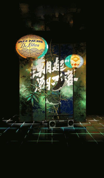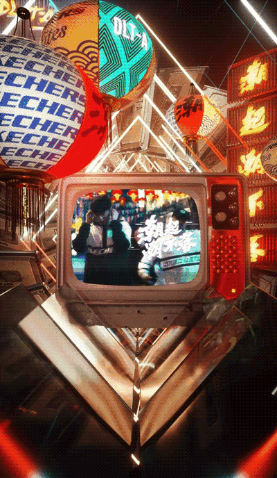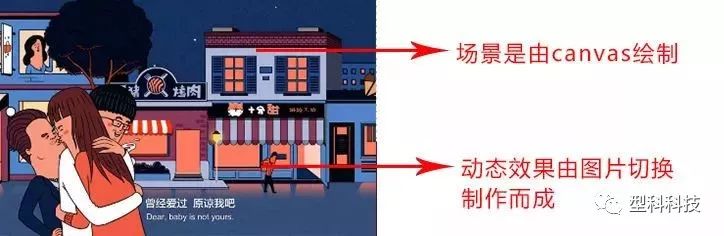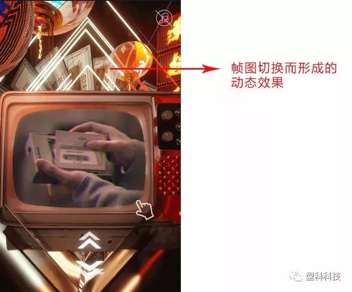 画面中的磁带、老电视机、灯笼、霓虹灯等元素均是在一张图上,到不同位置即切换到不同的图片形成动画效果。各处的细节表现还是很不错。