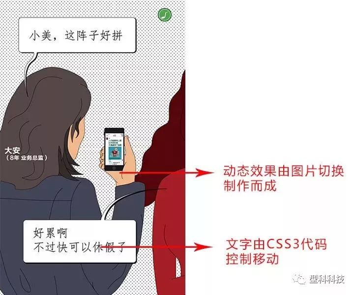 这款案例也可以说是长屏切换的h5,动态效果是不断换图制作,再以CSS3代码缩放形成,每段场景中的文字也是由CSS3代码控制移动,最后背景则是PNG图片。