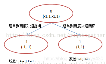 然后学习第二棵决策树,我们把第一棵的残差样本(A, -1岁)、(B,1岁)、(C, -1岁)、(D, 1岁)输入。此时我们选择的特征是经常去百度提问还是回答。这个时候我们又可以得到两部分,一部分是AC组成了左叶子,另一部分是BD组成的右叶子。那么,经过计算可知左叶子均值为-1,右叶子均值为1. 那么第二棵数的预测结果就是AC都是-1,BD都是1. 我们再来计算一下此时的残差,发现ABCD的残差都是0!学习完成。