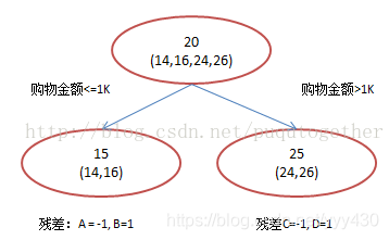 首先,输入初值20岁,根据第一个特征(具体选择哪些特征可以根据信息增益来计算选择),可以把4个样本分成两类,一类是购物金额<=1K,一类是>=1K的。假如这个时候我们就停止了第一棵树的学习,这时我们就可以统计一下每个叶子中包含哪些样本,这些样本的均值是多少,因为这个时候的均值就要作为所有被分到这个叶子的样本的预测值了。比如AB被分到左叶子,CD被分到右叶子,那么预测的结果就是:AB都是15岁,CD都是25岁。和他们的实际值一看,结果发现出现的残差,ABCD的残差分别是-1, 1, -1, 1。这个残差,我们要作为后面第二棵决策树的学习样本。