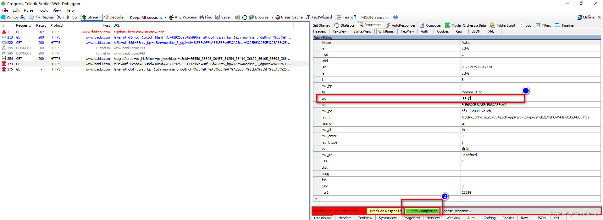 发起请求,拦截并修改请求参数并提交。将查询关键字换成“测试”