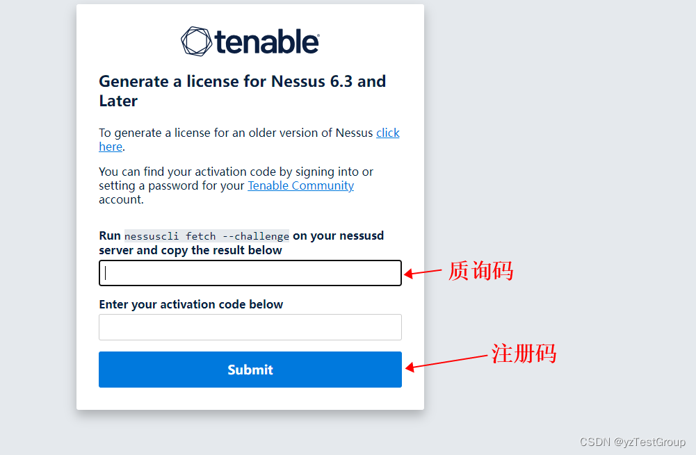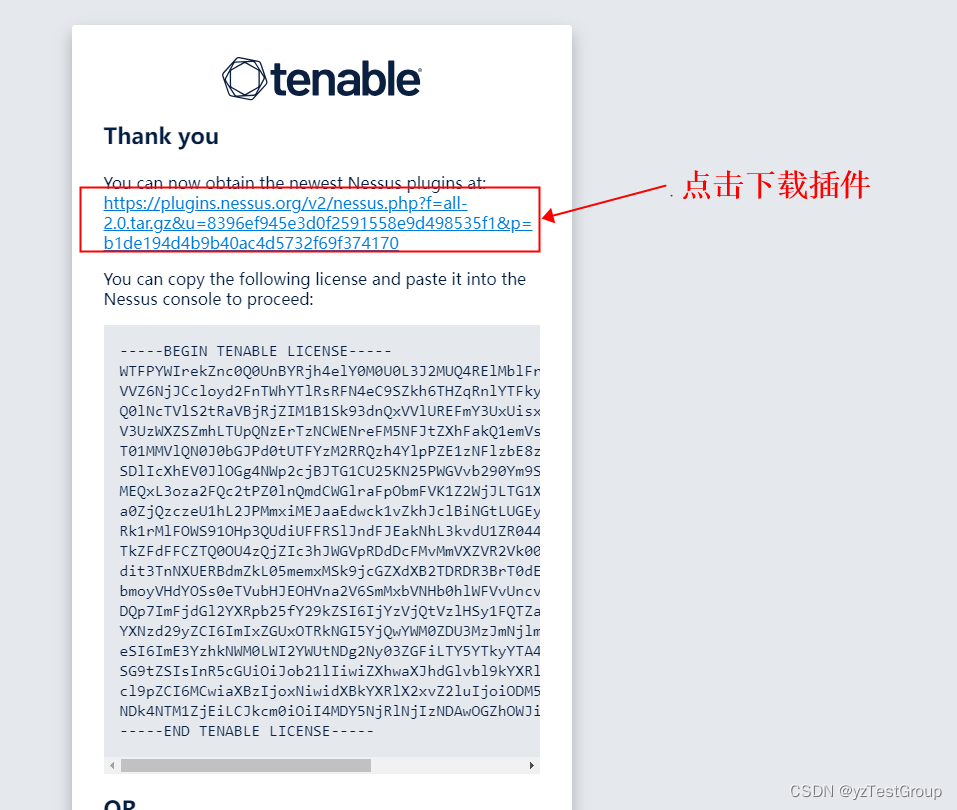 浏览器打开网页 Plugin Registration | Tenable®,输入第二步申请的注册码,以及上一步得到的质询码