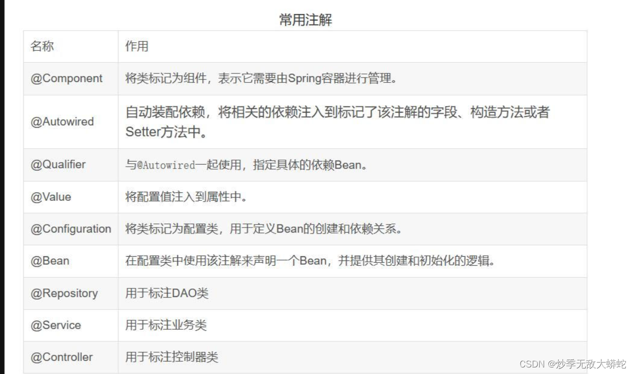 (1)@Component:用于标记一个类为Spring的组件,通常用于自动扫描组件并将其注册到Spring容器中。示例代码如下:
