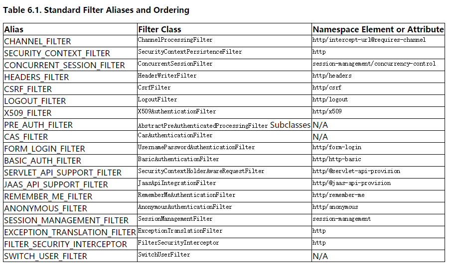 首先SpringSecurity Web是基于它所提供的一整套Filter链来实现的,我们来看下它所提供的有哪些Filter:
