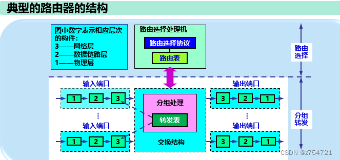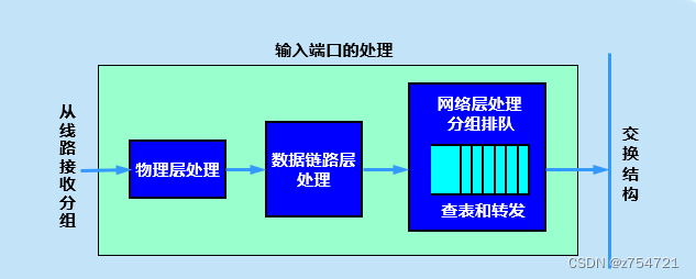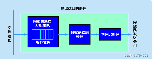 输出端口的处理流程:输入端口装有物理层、数据链路层和网络层的处理模块。在数据链路层剥去首部和尾部后,将分钟送到网络层的队列中排队等待处理。 网络层的输入端口处理模块有一个缓冲区。当输入链路的发送速率超过交换结构接收分组的速度时,来不及发送的分组交暂存在这个缓冲区。