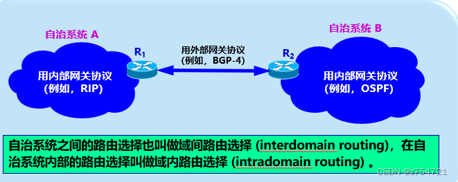 定义:在单一的技术管理下的一组路由器,而这些路由器使用一种 AS 内部的路由选择协议和共同的度量以确定分组在该 AS 内的路由,同时还使用一种 AS 之间的路由选择协议用以确定分组在 AS之间的路由。