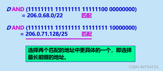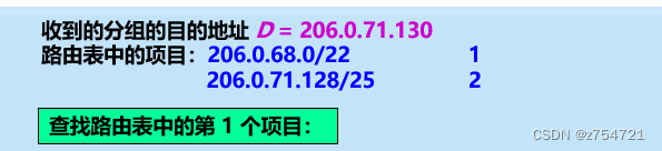 如果将目的网络与路由表中的项目做与运算,得到的结果都是匹配的话,那就选网络位数最多的。下面是一个例子(结果是选择项目二):