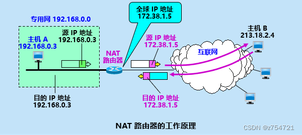 在安装NAT软件以后,路由器就可以具备网络地址转换功能。而这样的路由器也被成为NAT路由器。 当使用本地地址的主机与外界进行通信时,NAT路由器上会将其本地地址转换为全球IP地址,这样就成功实现本地地址与互联网进行通信