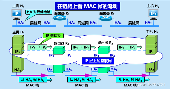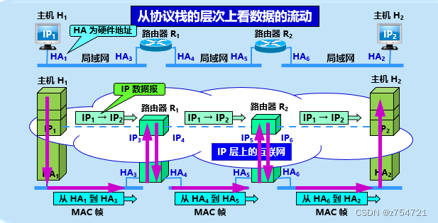 最后在看看这个。 从协议栈的角度看,就是MAC帧到一个路由器了,先通过IP地址,找到转发的接口或者说IP地址,通过这个IP地址找到对应的硬件地址进行物理意义上的转发。