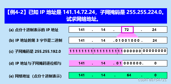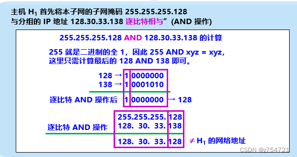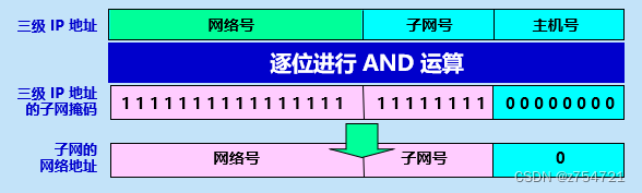 子网掩码的运算:将IP地址和子网掩码逐位坐与运算,就可以得到子网的网络地址。