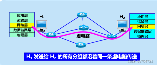 需要了解的概念——虚电路:这是一种基于连接导向的通信方式。具体来说就是,在实际的数据传输之前,通过一些列过程建立连接,指定收发双方的通信路径和参数,此后发送数据就按照这条虚电路传送。