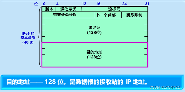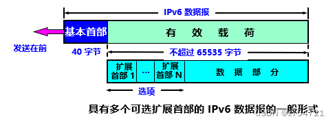 IPv6数据报的一般形式——由两部分构成:基本首部和有效载荷。其中有效载荷包括零个或多个拓展首部,在加上后面的数据部分。