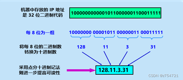 点分十进制记法:将原来的32位二进制代码,每8位1组,然后每组的8位二进制转换成十进制数字。这样可以提高可读性。
