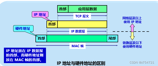 辨析:从层次的角度看,硬件地址是数据链路层和物理层使用的地址。而IP地址是网络层以上各层使用的地址。