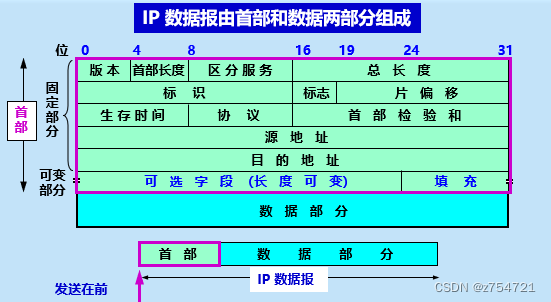 从整体来看:首部前面是固定长度,共20字节,是所有IP数据报必须具备的,后面的是可选字段(实际很少用到)