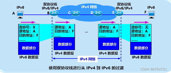 为了确保网络的可靠性和稳定性,向IPv6过渡只能采取逐步演进的办法,而且新安装的IPv6系统能够向后兼容:IPv6系统能够接受和转发IPv4分组,并能为IPv4分组提供路由。下面介绍两种向IPv6过渡的技术策略。