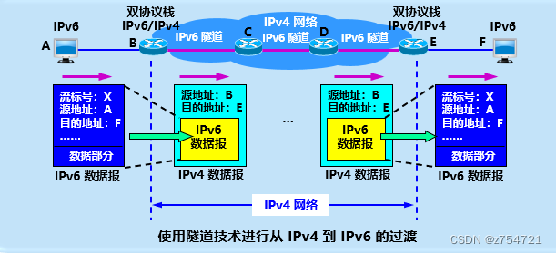 隧道技术指的是:在IPv6数据报进入IPv4网络时,把IPv6数据报封装成IPv4数据报,在IPv4数据报离开IPv4网络的隧道时,再把数据部分(原来的IPv6数据报)交给主机的IPv6协议栈