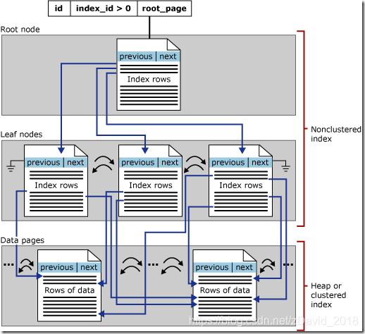可以看到,非聚集索引也是一个B树结构,与聚集索引不同的是,B树的叶子节点存的是指向堆或聚集索引的指针.