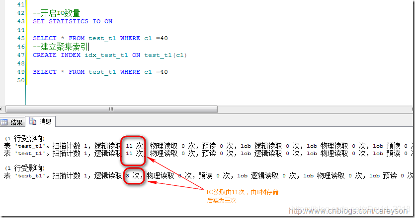现在这张表上没有任何索引,也就是以堆存放,我通过在其上加上聚集索引(以B树存放)来展现对IO的减少: