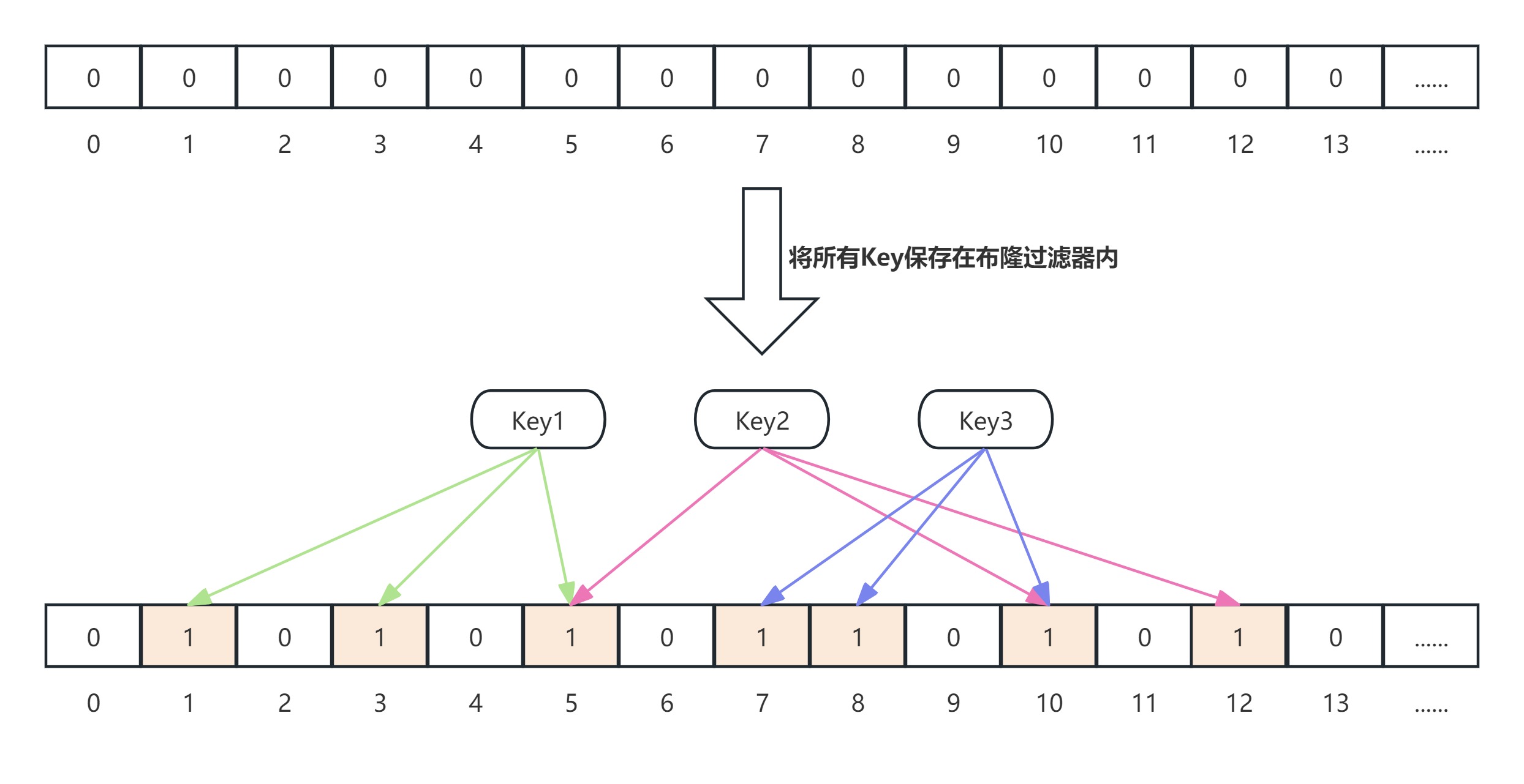 举个例子,假设我们一共有3个Key,我们对这3个Key分别进行3次哈希运算,Key1经过3次哈希运算后1、3、5,那么布隆过滤器中下标为1、3、5的元素值更新为1,然后对剩下的2个Key做同样的操作,结果如下图: