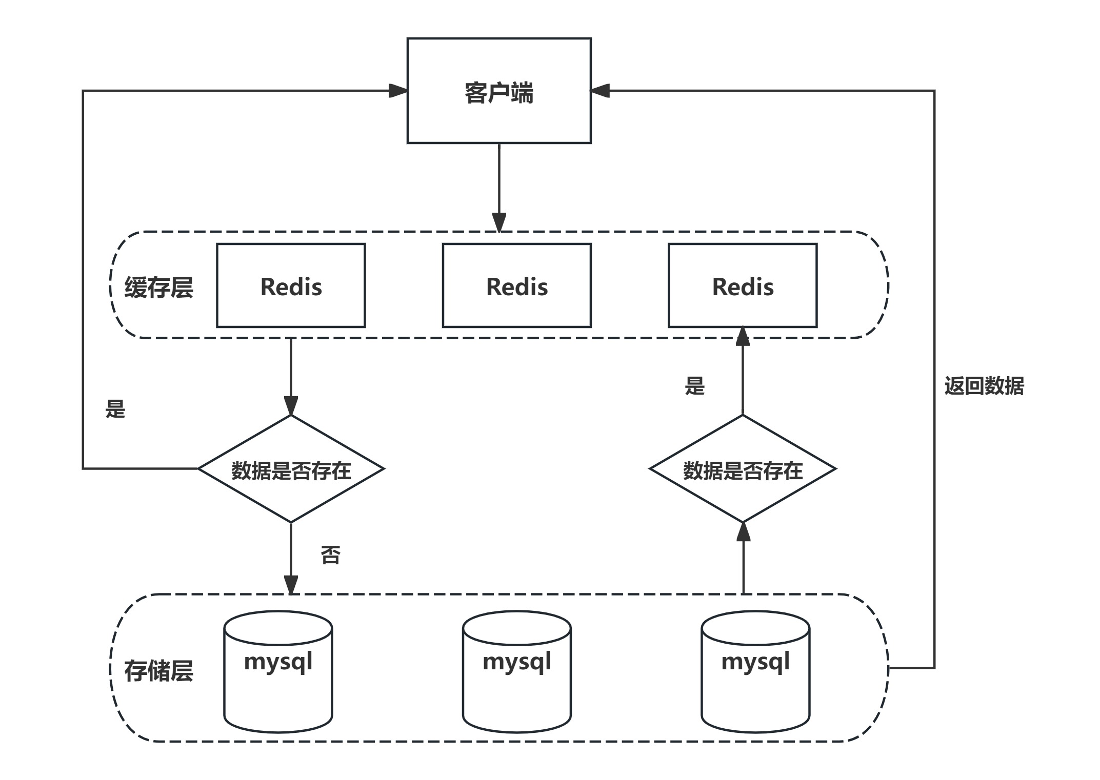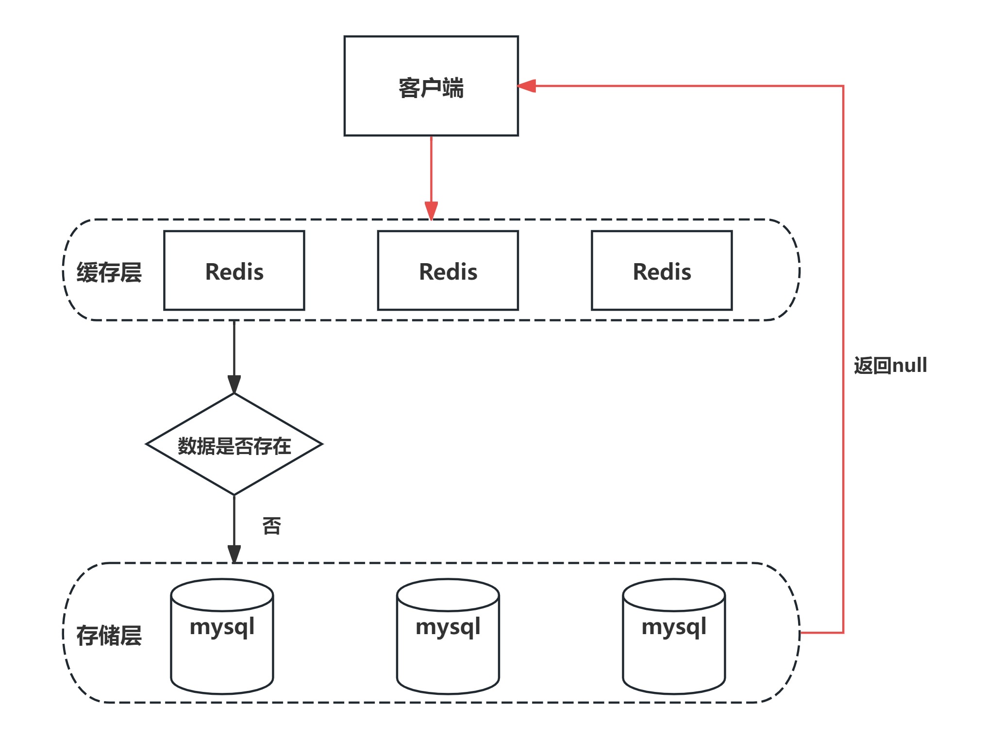 客户端发起一个查询请求的时候,首先去缓存中查询,如果数据在缓存中存在,则直接将缓存中的数据返回给客户端;如果数据在缓存中不存在,则继续查询数据库,如果数据在数据库中存在,则将该数据放入缓存中,并返回给客户端,如果数据也不在数据库中,则直接返回null给客户端。