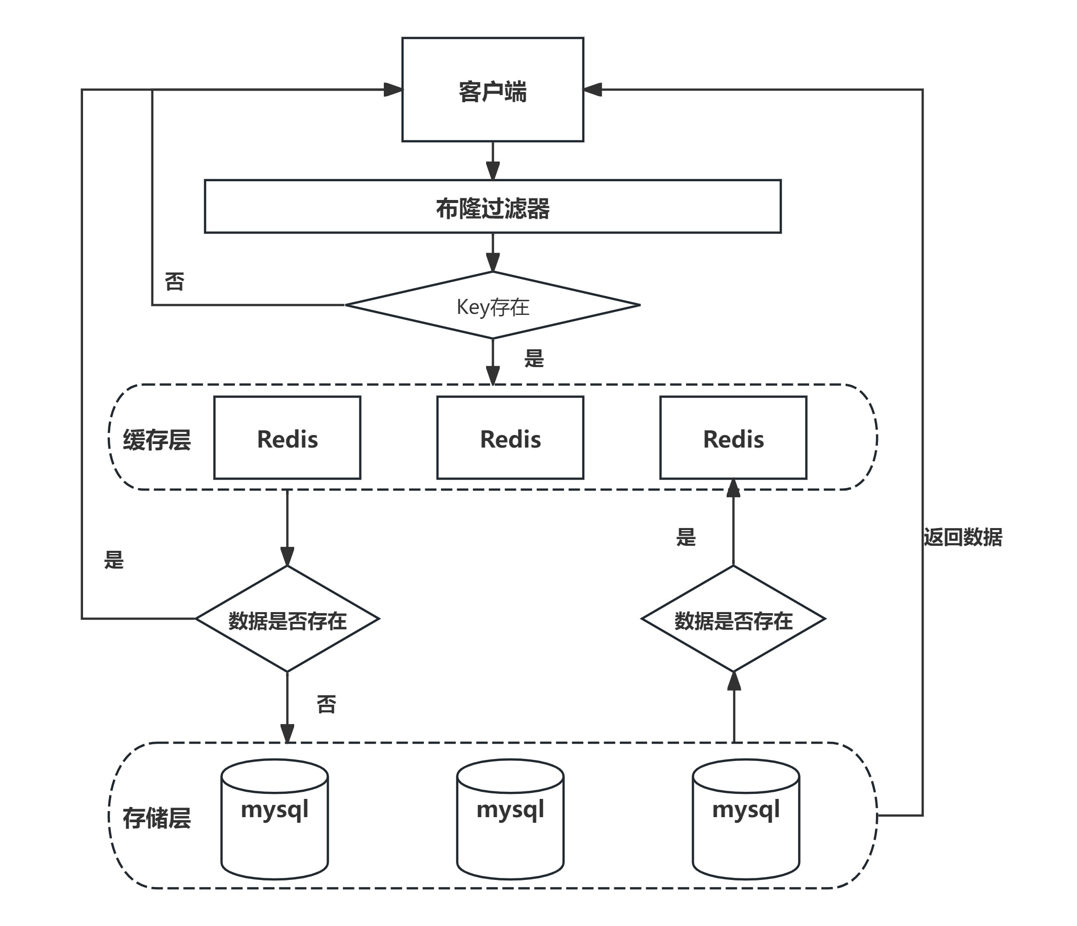 当客户端查询时,也对查询的Key做3次哈希运算得到3个位置,然后看布隆过滤器中对应位置元素的值是否为1,如果所有对应位置元素的值都为1,那么就证明Key在库中存在,则继续向下查询;如果3个位置中有任意一个位置的值不为1,则说明Key在库中不存在,直接返回给客户端空即可。所以,布隆过滤器就相当于一个位于客户端和缓存层之间的拦截器一样,负责判断key是否存在于集合中。