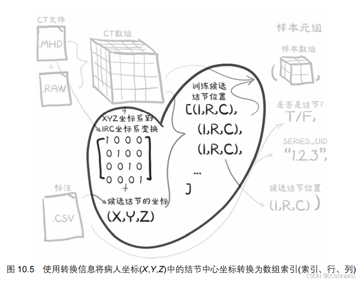 需要将病人坐标系中的结节中心坐标转换为数组坐标(I, R, C),以便从 CT 数据中提取感兴趣区域。