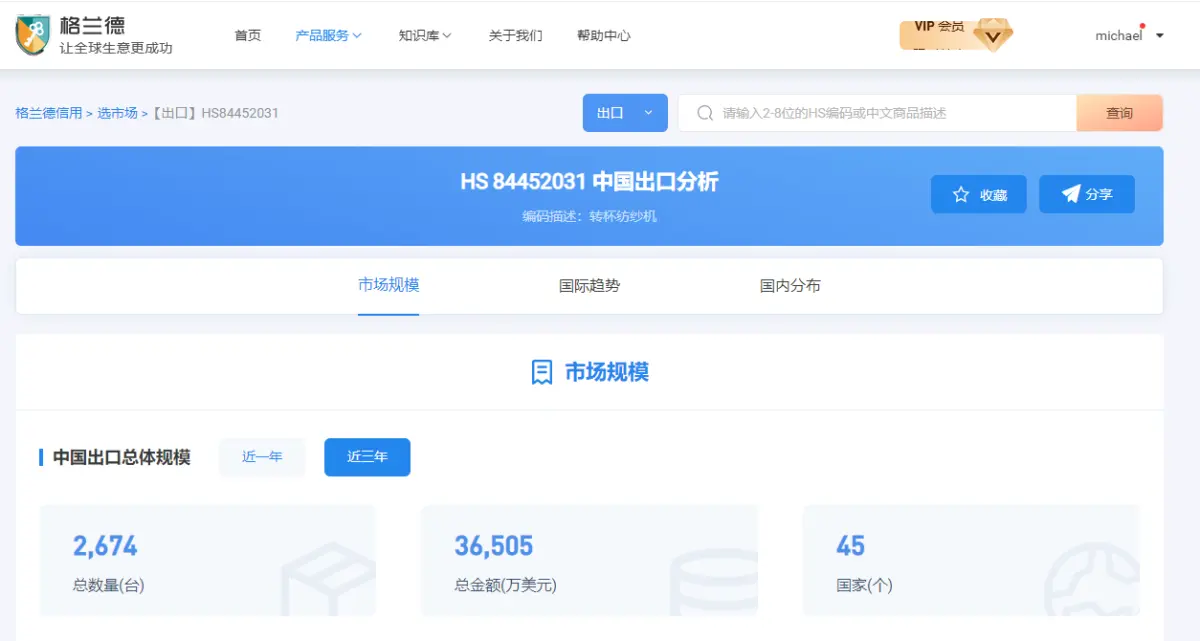 据格兰德选市场公布的数据显示,中国转杯纺纱机的HS编码是:84452031。