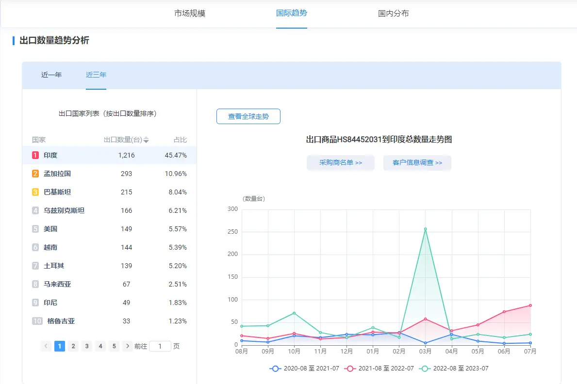 近三年来,中国转杯纺纱机出口印度数量总计914台,出口印度金额总计110,769,058美元,共销往海外41个国家,总计2,882台,33,512万美元。