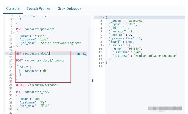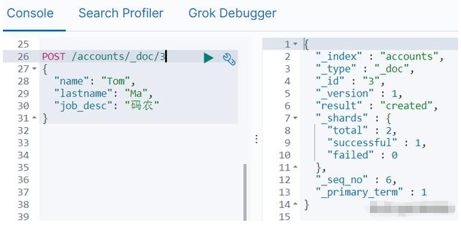POST /accounts/_doc/3 { "name": "Tom", "lastname": "Ma", "job_desc": "码农" }