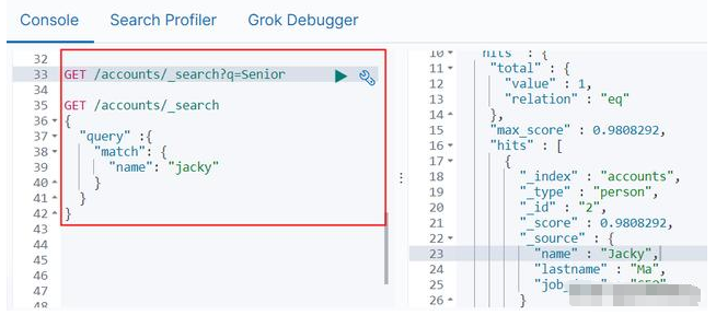 GET /accounts/_search { "query" :{ "match": { "name": "jacky" } } }