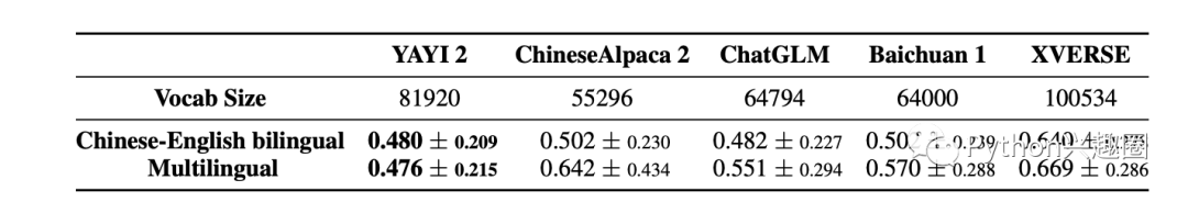 YAYI 2 采用 Byte-Pair Encoding(BPE)作为分词算法,使用 500GB 高质量多语种语料进行训练,包括汉语、英语、法语、俄语等十余种常用语言,词表大小为 81920。