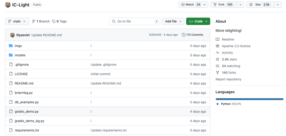 虽然IC-Light刚刚发布3天,但在GitHub就已经标星1.5k,目前已有2.5k。关注度和使用量都在飙升,而且已经有行业大佬推出了ComfyUI版本的IC-Light插件。