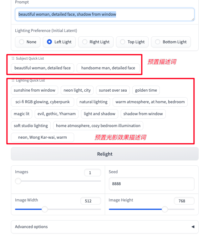 接下来就是一些高级选项,打光范围大小(长宽)、步长、种子等,类似采样器的一些参数,可以默认不设置。